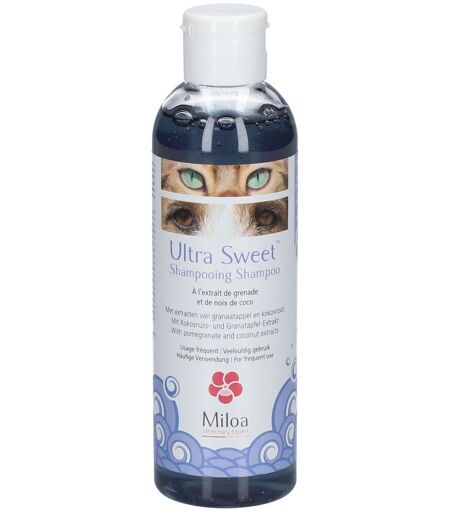 Ultra Sweet TM de Miloa nettoie en douceur tous les types de pelage y compris les plus sensibles grâce à ses bases lavantes douces.POUR CHIENS ET CHATS.Ultra Sweet TM nourrit en profondeur et permet un démêlage aisé pour une triple action protectrice, gainante et fortifiante.Résultat : le poil est brillant et tonifié.Sans parabèneSans laureth sulfateIndicationÉviter le contact avec les yeux. Usage externe uniquement. À conserver hors de portée des enfants. À utiliser dans les 24 mois après la date de fabrication.ApplicationAppliquer Ultra Sweet TM sur le poil préalablement mouillé à l’eau tiède.Bien répartir Ultra Sweet TM sur l’ensemble du pelage. Masser jusqu’à l’obtention d’une mousse légère. Laisser agir quelques minutes. Rincer abondamment.Peut être utilisé quotidiennement ou selon les recommandations du vétérinaire.IngrédientsÀ l’extrait de grenade et de noix de coco. ...