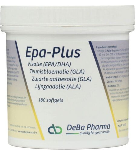 Complément alimentaire à utiliser dans le cadre d’une alimentation variée, équilibrée et d’un mode de vie sain.DeBa Pharma Epa-PlusEpa-Plus est une combinaison de divers acides gras, comme des oméga 3 et des oméga 6. Les acides gras oméga 3 présents sont l’ALA (acide alpha-linolénique extrait d’huile de lin), l’EPA (acide eicosapentaénoïque extrait d’huile de poisson) et le DHA (acide docosahexaénoïque extrait d’huile de poisson). Les acides gras oméga 6 sont le GLA (extrait d’huile d’onagre et d’huile de bourrache). Epa-Plus assure un équilibre entre les deux acides gras. L’oméga 6 a aujourd’hui une connotation négative, mais cela n’empêche pas que les bons acides gras oméga 6 ont une fonction importante. Le problème est cependant que l’homme est trop exposé aux mauvais acides gras oméga 6 présents dans la viande et les huiles végétales. De plus, nous mangeons trop peu de poisson gras, de sorte que le rapport entre l’oméga 6 et l’oméga 3 est complètement faussé, avec une prépondérance de l’oméga 6.Avantages d'Epa-PlusCombinaison d’acides gras oméga 3 et oméga 6Assure un équilibre général des deux acides grasContient également de la vitamine E, qui contribue à protéger les cellules du stress oxydatifIngrédientsHuile de poisson oméga-3 (TG) 550 mg, EPA (18% acide eicosapentaénoïque) 99 mg, DHA (12% acide docosahexaénoïque) 66 mg, huile d'onagre 200 mg (pressée à froid) - GLA (8% acide gamma linolénique) 16 mg, huile de lin 150 mg - ALA (57% acide alpha-linolénique) 85,50 mg, huile de Ribes nigrum 100 mg (cassis) - GLA (14% acide gamma-linolénique) 14 mg, vitamine E (acétate de d-alpha-tocophérol) 10 mg (83,33% RDA), agent d'enrobage : gélatine, gélifiants : glycérol et eau purifiée.Conseils d'utilisation1 à 3 capsules par jour pendant ou après repas.Précautions d'emploi Conserver dans un endroit frais et sec. Tenir hors de portée des jeunes enfants. Ne pas dépasser la dose recommandée. Poids net180 softgelsFabricantDeba PharmaDumolinlaan 13,8510 CourtraiBelgique ...