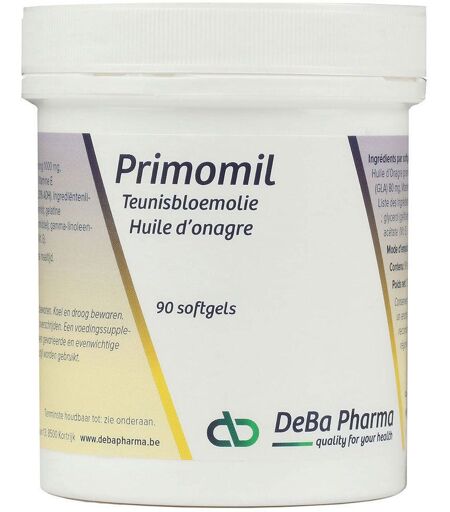 Complément alimentaire à utiliser dans le cadre d'une alimentation variée, équilibrée et d'un mode de vie sain.Primomil de Deba Pharma est un complément alimentaire à base d'huile onagre riche en oméga 6.Aide en cas d’acné et d’eczéma et soutient le cœur et les vaisseaux sanguinsAtténue les douleurs menstruelles et les symptômes de la ménopauseContribue à un poids normalAtténue les crampes, les flatulences et la diarrhéeComposition :huile d'onagre (oenothera biennis), gelatine (capsule), glycérol (gélifiant), acide gamma-linolénique (GLA), dl-alphatocophérol acétate (vitamine E)Valeur nutritionnelle : Par softgelAJR*Huile d'onagre (8 % GLA)1 000 mg-Vitamine E10 mg83,33 %* AJR = Apports journaliers recommandésConseils d'utilisation :1 à 3 softgels par jour avant les repas ou comme prescrit.Précautions d'emploi :Ne pas dépasser la dose journalière recommandée. Tenir hors de portée des enfants.Poids net :126 g = 90 softgelsFabricant :Deba PharmaDumolinlaan 13B-8500 KortriBelgique ...