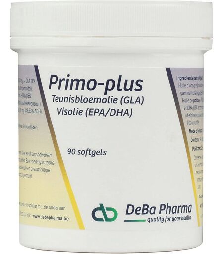 Complément alimentaire à utiliser dans le cadre d'une alimentation variée, équilibrée et d'un mode de vie sain.Primo-Plus de Deba Pharma est un complément alimentaire à base d'huile onagre riche en oméga 6 et oméga 3.combinaison d’acides gras oméga 6 et oméga 3assure un équilibre général des deux acides grascontient également de la vitamine E contre l’oxydationPrimo-Plus contient une combinaison de l’acide gras oméga 6 GLA et des acides gras oméga 3 EPA et DHA. En comparaison avec Primomil, Primo-Plus contient une petite quantité d’EPA et de DHA, afin d’inhiber la transformation d’acide dihomo-gamma-linolénique (DGLA) en acide arachidonique libre. Le GLA apporte un soutien en cas de problèmes cutanés et peut être utilisé en cas de dérèglement hormonal chez la femme, comme le syndrome prémenstruel.Composition :huile d'onagre (oenothera biennis), gelatine (capsule), glycérol (gélifiant), acide gamma-linolénique (GLA), dl-alphatocophérol acétate (vitamine E)Valeur nutritionnelle : Par softgelAJR*Huile d'onagre (1ière pression à froid)Huile de poisson (18% EPA / 12% DHA) 800 mg200 mg-Vitamine D (d-alfa) 10 mg83,33 %* AJR = Apports journaliers recommandésConseils d'utilisation :1 à 3 softgels par jour avant les repas ou comme prescrit.Précautions d'emploi :Ne pas dépasser la dose journalière recommandée. Tenir hors de portée des enfants.Poids net :126 g = 90 softgelsFabricant :Deba PharmaDumolinlaan 13B-8500 KortriBelgique ...