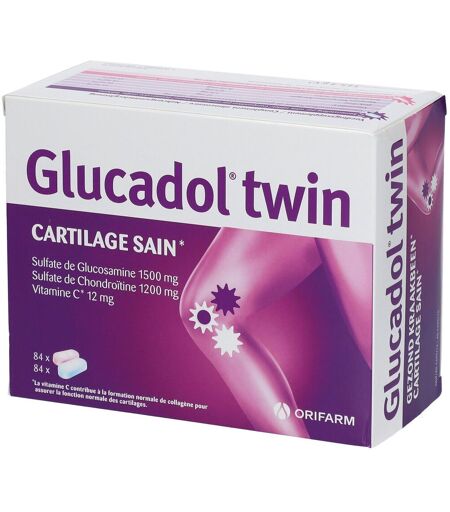 Complément alimentaire à utiliser dans le cadre d'une alimentation variée, équilibrée et d'un mode de vie sain.Glucadol® Krill contribue au bon fonctionnement du cartilage et des articulations.La glucosamine est le composant de base du cartilage.La vitamine C contribue à la formation normale de collagène pour assurer la fonction normale des cartilages.Le zinc, le manganèse et le sélénium contribuent à protéger les cellules contre le stress oxydatif.La chondroïtine est un composant de base du cartilage.Composition :Comprimé blanc : 1500 mg de glucosamine sulfate, 12 mg de vitamine C, 1,5 mg de zinc, 0,3 mg de manganèse, 8,25 mcg de séléniumComprimé rose : 1200 mg de sulfate de chondroïtineValeur nutritionnelle : Pour 1 comprimé blancAJR*Sulfate de glucosamine1 500 mg-Vitamine C12 mg 15 %Zinc1,5 mg15 %Manganèse0,3 mg15 %Sélénium8,25 mg15 % Pour 1 comprimé roseAJR*Sulfate de chondroïtine1 200 mg-* Apports journaliers de référenceConseils d'utilisation :Prenez 1 comprimé blanc et 1 rose de Glucadol Twin par jour, soit le matin, soit le soir. Les comprimés peuvent être pris avec ou sans nourriture. Les comprimés peuvent être avalés plus facilement avec de la nourriture.Il est fortement conseillé de suivre le traitement pendant au moins 3 mois.Précautions d'emploi :Ne pas dépasser la dose journalière recommandée. Tenir hors de portée des enfants.Poids net :343,7 g = 168 comprimés (84 comprimés blancs + 84 comprimés roses)Fabricant :Takeda BelgiumChaussée de Gand 6151080 BruxellesBelgique ...