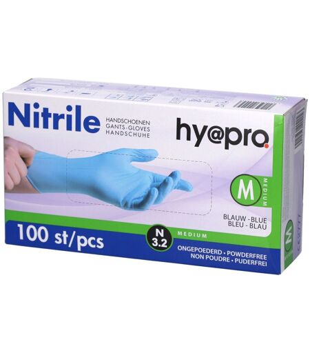 Gants en nitrile bleusSans poudre M3,0100 pièces par distributeurNe contient pas de latexConforme au règlement relatif aux dispositifs médicaux (UE) 2017/745, à la norme EN 455, au règlement relatif aux EPI (UE) 2016/425, aux normes EN 420 et EN ISO 374.Taille : small (largeur : 80 ± 10 mm, longueur ≥ 240 mm).BénéficesUsage unique.Gants d'examen jetables à usage unique.Non stériles.Gants de protection jetables adaptés au contact alimentaire (aliments acides, aqueux, gras, alcoolisés ou secs).Les gants présentent une bonne résistance aux micro-organismes (virus, bactéries et champignons).Conserver entre 10 °C et 30 °C, au sec et à l'abri de la lumière dans l'emballage d'origine.Protéger de l'ozoneÉliminer conformément aux réglementations locales en vigueur. ...