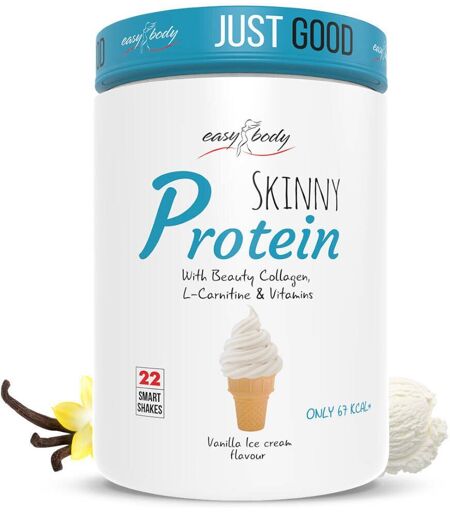 Complément alimentaire à utiliser dans le cadre d’une alimentation variée, équilibrée et d’un mode de vie sain.SKINNY PROTEIN GLACE À LA VANILLEPréparation à haute teneur en protéineEnrichie en collagène pour une meilleure qualité de la peau vieillissanteContient des vitamines afin de combler certaines carencesL’ajout de L-Carnitine aidera dans le processus de perte de poidsSeulement 67 kcal par portion Très riches en protéines et aux arômes variés, les nouveaux smart shakes Skinny Protein vont devenir le partenaire principal de votre régime hyper protéiné. Leur faible teneur en glucides et en lipides en font un atout pour toute personne désirant combiner vitalité, bien-être et équilibre. Véritable milkshake sans sucre ajouté, cette formule enrichie avec de la L-Carnitine et du collagène de beauté vont vous aider à perdre du poids plus efficacement et à améliorer la qualité de votre peau en comblant vos carences en vitamines.Il est recommandé de consommer Skinny Protein une à deux fois par jour dans le cadre d’un programme de perte de poids. Avec sa nouvelle formule légère et rapidement assimilée par l’organisme, elle contient 15 g de protéine et seulement 67 kcal par portion. Consommer un smart shake de Skinny Protein vous aidera également à réduire la sensation d’appétit et ainsi d’éviter les snacks trop caloriques. Respectueuse de votre corps et bénéfique pour votre bien-être et vos performances sportives, n’attendez plus et découvrez en exclusivité notre nouvelle poudre minceur protéinée Skinny Protein !NE FORMULE MODERNE ET SEXY POUR PLUS DE RÉSULTATSLe nouveau complément alimentaire Skinny Protein a été spécialement conçu pour aider à la combustion des graisses, pour améliorer l’endurance lors de l’effort ainsi que le maintien d’une belle silhouette. Sa formule a été enrichie avec de la L-Carnitine ainsi que du collagène pour une double action à la fois sur la peau et sur la perte de poids. En effet, lors de l’effort, la L-Carnitine va venir aider le corps à aller puiser dans les réserves de graisses pour brûler de l’énergie. De plus, elle va aider à l’oxygénation du sang pendant l’effort, apportant ainsi un effet de “second souffle” et donc améliorer l’endurance globale. Le collagène quant à lui représente environ ⅓ des protéines présentes dans l’organisme et assure la cohésion, l’élasticité et la régénération des tissus tels que les cartilages, les tendons et la peau. Le collagène va ainsi vous aider à avoir une peau plus belle et en meilleure santé, tout en améliorant l'élasticité et le bien-être de vos tissus.Skinny Protein se démarque également par le très haut taux de protéine dérivé de la Whey Isolate qu’elle propose avec un taux de glucides très faible. Avec seulement 67 kcal par portion, Skinny Protein vous apporte les nutriments dont vous avez besoin en complément d’une alimentation saine et équilibrée pour stimuler vos performances et votre perte de poids sans surplus de gras et de glucides. La protéine présente en grande... ...
