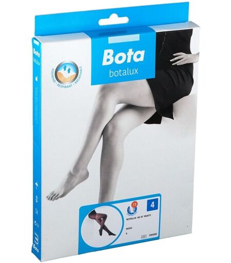 Botalux 40Bas de soutien 40 denier (7/9 mm Hg)Panty de soutien “AT+P”(avec orteils (+P)IndicationsJambes fatiguées/lourdesComposition81% PA, 19% ELConditionnement1 pièce ...