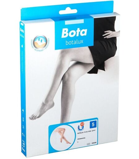 Botalux 70 Bas de soutien 70 denier (15/18 mm Hg) Bas jarret “AD” (avec orteils (+P) ou sans orteils (-P)) Bas de soutien “AG” Stay-up “SU” (avec orteils (+P) ou sans orteils (-P)) Panty “AT” Maternity “ATM” Indications Jambes fatiguées/lourdes, profession debout/sédentaire, grossesse Composition 81% PA, 19% EL Conditionnement 1 collant ...