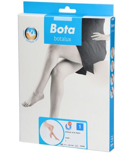 Bota Botalux 70 Bas de soutien 70 denier (15/18 mm Hg) Jarret “AD+P ou -P” Bas de soutien “AG+P” Stay-up “SU+P ou -P” Panty “AT+P” Maternity “ATM+P” (avec orteils (+P) ou sans orteils (-P)) Indications Jambes fatiguées/lourdes, profession debout/sédentaire, grossesse Composition 81% PA, 19% EL Conditionnement 1 pièce ...