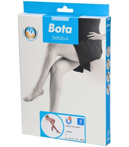 Bota Botalux 70 Bas de soutien 70 denier (15/18 mm Hg) Jarret “AD+P ou -P” Bas de soutien “AG+P” Stay-up “SU+P ou -P” Panty “AT+P” Maternity “ATM+P” (avec orteils (+P) ou sans orteils (-P)) Indications Jambes fatiguées/lourdes, profession debout/sédentaire, grossesse Composition 81% PA, 19% EL Conditionnement 1 pièce ...