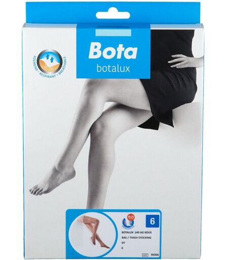 Le bas de soutien Botalux est un produit médical et thérapeuti- que, ayant une compression dégressive et une excellente forme d'adaptation. Assortiment BOTALUX 40 BOTALUX 70 BOTALUX 140 Le BAS DE SOUTIEN n'est pas un BAS A VARICES. Ce bas, avec son tricot ultra-fin et aéré, son toucher souple, est un bas de soutien ELEGANT d'une compression légère. Le prix est nettement moins cher qu'un bas à varices. Indication AD-AG-SU-AT-ATM (compression à la cheville: ± 19 mm Hg) Jambes fatiguées ou jambes lourdes, profession sédentaire, grossesse - tend- ance aux varices Ingrédients 19% elastodien, 81% polyamide. ...