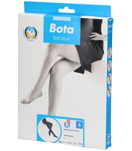 Botalux 140 Bas de soutien 140 denier (19/22 mm Hg) Bas jarret “AD” (avec orteils (+P) ou sans orteils (-P)) Bas de soutien “AG” Stay-up “SU” (avec orteils (+P) ou sans orteils (-P)) Panty “AT” Maternity “ATM” Indications Jambes fatiguées/lourdes, profession debout/sédentaire, grossesse, tendance aux varices Composition 81% PA, 19% EL Conditionnement 1 pièce ...