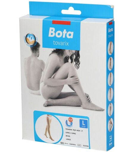 Tovarix 70/II Bas à varices en microfibre et fibre Seacell® Active – classe 2 (25 / 32 mm Hg) Bas jarret “AD-P” (court/long) Bas cuisse avec silicone “AGH-P” (court/long) Bas cuisse avec ceinture “AGT-P” (court/long) (gauche/droite) (avec orteils (+P) ou sans orteils (-P)) Indication Oedème léger, jambes lourdes/fatiguées, grossesse, tendances modérées aux varices, thrombose, phlébite, péniostite tibiale Taille : voir tableau TABLEAU DES MESURES TOVARIX 20/I, 20/II, 50/I, 50/II, 50/III, 70/II EN 70/III CIRCONFERENCE EN CM SMALL MEDIUM LARGE XLARGE T TAILLE 70-85 75-95 80-100 85-110 H HANCHE 90-115 95-125 100-130 105-135 G CUISSE 48-63 54-67 58-72 63-74 D SOUS GENOU 28-38 32-41 35-44 38-46 C MOLLET 29-39 33-42 36-45 39-47 B CHEVILLE 19-23 23-26 26-29 29-31 Composition 62% PA, 26% EL, 8% CO, 4% Seacell® Active Conditionnement 1 paire ...