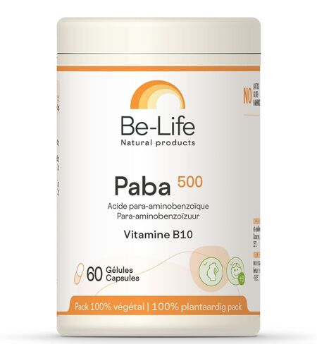 Complément alimentaire à utiliser dans le cadre d’une alimentation variée, équilibrée et d’un mode de vie sain.Besoin de provitamine B : optez pour Paba 500 Votre conseiller santé vous a recommandé de la provitamine B, appelée aussi vitamine B10 ? Voici un excellent produit, préparé en Belgique suivant les hautes exigences de qualité du laboratoire Bio-Life et proposé en gélules végétales. 1-2 gél./jour maxComposition:Acide para-aminobenzoïque 500 mgMg stéarate (anti-agglomérant)Phosphate tricalcique (agent de charge)Valeur nutritionelle: Pour 2 gélules*AJRAcide para-aminobenzoïque (Vitamine B10)1000 mg-*Apport journalier de référenceConseil d'utilisation:1 à 2 gélules par jour, durant les repas, ou suivant avis médical.Précautions d'emploi:A consommer avec un verre d'eau, Ne pas dépasser la dose maximale, Conserver au sec et hors de portée des enfants.Poids net:60 gélulesFabricant:Bio-Life® Parc Scientifique CréalysRue Camille Hubert 335032 Isnes ...