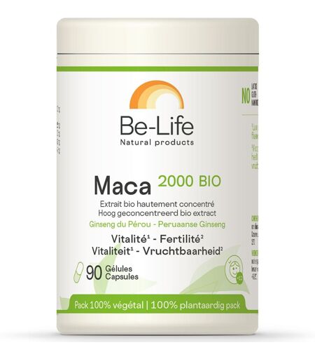 Complément alimentaire à utiliser dans le cadre d’une alimentation variée, équilibrée et d’un mode de vie sain.Be-Life Maca 2000 est un complément alimentaire à base de maca biologique hautement concentrée, connue pour ses effets bénéfiques sur la vitalité et la fertilité. À utiliser dans le cadre d’une alimentation variée, équilibrée et d’un mode de vie sain.IngrédientsExtrait de racine de Maca 4:1 (Lepidium meyenii Walp.) bio, protéine de riz (Oryza sativa L.) bio, maltodextrine bio, fibres d'acacia (Acacia seyal Delile) bio.Valeurs nutritionnelles IngrédientQuantité par gélule Maca bio500 mg Conseils d'utilisationPrendre 1 à 2 gélules par jour, le matin avec un repas.Précautions d'emploiConserver au frais, au sec et à l'abri de la lumière. Veuillez tenir compte des indications de stockage sur l'emballage. Ne pas dépasser la dose recommandée. Suivant avis médical en cas de grossesse ou d’allaitement, ou en cas de prise d’anticoagulant.Poids net90 capsules = 74 gAdresse du FabricantBio LifeRue Camille Hubert 335032 GemblouxBelgique ...