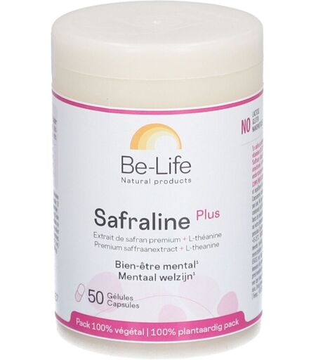Complément alimentaire à utiliser dans le cadre d’une alimentation variée, équilibrée et d’un mode de vie sain.Cap sur l'équilibre mental De petites actions peuvent avoir de grands effets pour booster le moral et doper les niveaux de dopamine et sérotonine. Bouger, s'aérer, profiter de la lumière et dormir en font partie. Certains compléments nutritionnels peuvent aussi apporter un soutien. Safraline Plus est une synergie de plantes (safran, thé vert, poudre de quinoa…), vitamines, acides aminés et minéraux (zinc) pour maintenir une humeur positive. Entrent dans la composition de Safraline Plus :• Le safran, qui contribue à une humeur positive et à l'équilibre émotionnel. Des études scientifiques se sont penchées sur le rôle du safran dans le cadre de son action au niveau de la dopamine, de la noradrénaline et de la sérotonine, des neurotransmetteurs importants pour l'équilibre psychologique. • La L-théanine, un acide aminé naturellement présent dans le thé.• La poudre de quinoa, qui apporte une partie des vitamines B présentes dans ce produit de santé• Le GABA, un neurotransmetteur inhibiteur naturellement présent dans l'organisme• L-tyrosine, un précurseur de L-DOPA qui lui-même est un précurseur de la dopamine, puis de la noradrénaline et de l'adrénaline.• Le zinc, qui contribue à une fonction cognitive normale• Les vitamines B1, B3, B6, B8, B9 et B12, qui contribuent à des fonctions psychologiques normales.A recommander en cas de périodes passagères de baisse de moral BénéficesGélule végétale acido-résistanteGélule végétale acido-résistanteLaboratoire fabricantLaboratoire fabricantSans glutenSans glutenSans lactoseSans lactoseSans nanoparticulesSans nanoparticulesIngrédientsL-théanine, Quinoa powder, Gamma-aminobutyric acid (GABA), L-tyrosine, Zinc L-pidolate, Saffron extract, Acacia fiber, Pyridoxal 5'-phosphate, Methylcobalamin, 5-methyltetrahydrofolate of glucosamineValeurs nutritionnellesIngrédientQuantité pour 2 gélules% AR*Zinc10 mg100 %Vitamine B10,55 mg50 %Vitamine B20,7 mg50 %Vitamine B38 mg50 %Vitamine B53 mg50 %Vitamine B62,1 mg150 %Vitamine B825 µg50 %Vitamine B9200 µg100 %Vitamine B123 µg120 %L-théanine (thé vert)300 mg-GABA100 mg-L-tyrosine100 mg-Crocine (safran)1 mg-Safranal (safran)0,75 mg-Conseils d'utilisation1-2 gél./jourPrécautions d'emploiConsommer moins de 800 mg de (-)-3-gallate d'épigallocatéchine (EGCG) par jour. Ne pas consommer si vous prenez le même jour d'autres produits contenant du thé vert. Epigallocatechin gallate (EGCG) : 10 mg/ 2 gél. Interdit aux femmes enceintes/allaitantes et aux enfants de moins de 18 ans. Ne pas consommer à jeun. Le safran peut avoir un effet abortif s'il est consommé à forte dose. Sur avis médical en cas de prise conjointe d'antidépresseurs chimiques ou de L-Dopa ou en cas d'hyperthyroïdie. Le GABA ne doit pas être pris par des personnes souffrant de troubles dépressifs bipolaires ou unipolaires.Poids net50 gélulesAdresse du FabricantBio-Life Laboratoryrue Camille Hubert 335032 Isnes ...