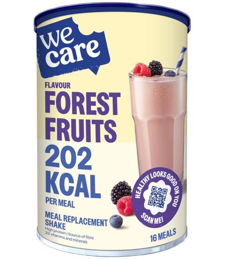 Il est important d'avoir une alimentation variée et équilibrée et un mode de vie sain.We Care Shake Forest FruitsLe substitut de repas WeCare Forest Fruit Shake est idéal pour les régimes hypocaloriques. Il s'agit d'un substitut de repas complet contenant 23 vitamines et minéraux, riche en protéines et en fibres, avec seulement 202 kcal.Subrsitut de repas completAvec 23 vitamines et minéraux202 kcal par repasSource de fibresIngrédientsMaltodextrine, fibre de chicorée : inuline, sucre, huile de soja entièrement raffinée, protéines de blé, minéraux (potassium, magnésium, calcium, phosphore, fer, zinc, iode, manganèse, cuivre, sélénium), épaississant : gomme de cellulose, arômes (contient du lait), sirop de glucose, sel marin, jus de betterave rouge concentré, protéines de lait, cassis déshydraté 0,36%, vitamines (C, E, niacine, acide pantothénique, A, D, B1, B6, B12, B2, K, acide folique, biotine), amidon, framboise déshydratée 0,18%, mûre déshydratée 0,11%, correcteur d'acidité : acide citrique.Peut contenir des traces de soja et de céleri.Données nutritionnelles NutritionPour 100 gPar shake**%AR*Energie1715 kJ409 kcal851 kJ202 kcal Graisses13 gdont graisses saturées 2,0 g3,8 g dont graisses saturées 0,8 g Glucides54 gdont sucres 19 g27 gdont sucres 18 g Fibres14 g3,8 g Protéines12 g13 g Sel1,6 g0,82 g Vitamine A1214 µg330 µg41%Vitamine D5,8 µg1,6 µg32%Vitamine E20 mg5,4 mg45%Vitamine K^(1)104 µg28 µg37%Vitamine C141 mg38 mg48%Thiamine (B1)2,7 mg0,81 mg74%Riboflavine (B2)2,7 mg1,2 mg86%Niacine (B3)25 mg7,3 mg46%Vitamine B62,3 mg0,71 mg51%Acide Folique349 µg112 µg56%Vitamine B123,6 µg2,1 µg84%Biotine78 µg21 µg42%Acide pantothénique13 mg3,5 mg58%Potassium (2)523 mg578 mg29%Calcium150 mg369 mg46%Phosphore206 mg330 mg47%Magnésium362 mg129 mg34%Fer16 mg4,3 mg31%Zinc14 mg5,0 mg50%Cuivre1,5 mg0,40 mg40%Manganèse3,2 mg0,86 mg43%Sélénium84 µg25 µg45%
