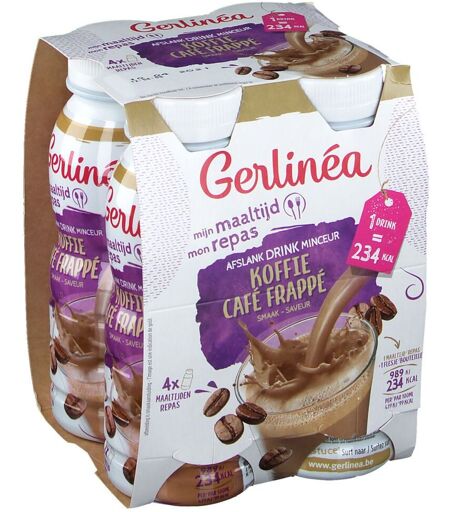 Il est important d'avoir une alimentation variée et équilibrée et un mode de vie sain.Boisson minceur complète et prêt à boire avec la délicieuse saveur café.Un repas complet avec 234 caloriesRiche en protéines et en fibres11 vitamines et 9 minérauxPrêt à l'emploi, parfait pour les déplacements!Substitut de repas pour perdre du poids.Faible en calories et un repas complet en même temps. Le délicieux repas à boire au saveur de café contiennent tout ce dont votre corps a besoin: protéines, fibres, vitamines et minéraux. Grâce à leur taille pratique et à leur capuchon refermable, vous pouvez l'emporter partout avec vous.Le conseil de Gerlinéa: buvez-le froid pour avoir le meilleur goût!Composition:LAIT écrémé, eau, sucre, protéines de LAIT, huile de tournesol , arôme (colorant: caramel ammoniacal), épaississants: cellulose, carboxyméthylcellulose sodique et carraghénanes, minéraux (citrate de sodium, citrate de potassium, sels de potassium de l'acide orthophosphorique, oxyde de magnésium, hydroxyde de potassium, sulfate ferreux, sulfate de zinc, sulfate de cuivre, sulfate de manganèse, iodure de potassium, sélénite de sodium), vitamines (C, E, A, D, B1, B6, B2, niacine, acide pantothénique, acide folique, biotine, B12) , sirop de glucose, arôme naturel, amidon de BLÉ, édulcorant: acésulfame-K, LACTOSEValeur nutritionnelle: Pour 100 g*AJR Par portion**(236 ml)**%AJRÉnergie389kJ/93kcal 5%918kJ/219kcal 11%Matières grasses2,5g4%5,9g8%- Dont acides gras saturés0,3g2%0,7g4%- Dont acides gras mono-insaturés 0,7g 1,7g - Dont acides gras polyinsaturés12g 2,8g Glucides10g4%24g9%- Dont sucres10g11%24g26%Fibres alimentaires2,2g 5,2g Protéines6,4g13%15g30%Sel0,22g4%0,52g9%Vitamine A219μg27%517μg65%Vitamine D1,2μg24%2,8μg57%Vitamine E2,4mg20%5,7mg47%Vitamine C22mg28%52mg65%Thiamine (B1)0,33mg30%0,78mg71%Riboflavine (B2)0,34mg24%0,80mg57%Niacine (B3)2,3mg14%5,4mg34%Vitamine B60,25mg18%0,59mg42%Acide folique53μg27%125μg63%Vitamine B120,49μg20%1,2μg46%Biotine3μg6%7,1μg14%Acide pantothénique0,82mg14%1,9mg32%Potassium254mg13%599mg30%Calcium119mg15%281mg35%Phosphore100mg14%236mg34%Magnésium27mg7%63,7mg17%Fer2,1mg15%5mg35%Zinc2mg20%4,7mg47%Cuivre0,23mg23%0,54mg54%Manganèse0,23mg12%0,54mg27%Sélénium14μg25%33μg60%Iode36μg24%85μg57%aaAJR= Apports Journalier de Référence*Apports de référence pour une journée d'un adulte type (8400kJ/2000kcal).**Une portion équivaut à 236mlConseil d'utilisation:Emportez ce délicieux repas à boire Gerlinéa dans votre sac et laissez-vous surprendre par un repas rapide et équilibré. L’utilisation est simple: Agitez, laissez reposer un instant et savourez! Á déguster de préférence frais. Remplacez un de vos repas principaux par un Repas à Boire pour une aide au maintien du poids. Pour contribuer à la perte de poids, remplacez deux repas par un substitut de repas.Précautions d'emploi:Conserver au sec et à température ambiante.Poids net:944 ml = 4 x 236 mlFabricant:NUTRITION & SANTE SASRoute de Castelnaudary31250 REVELFrance ...