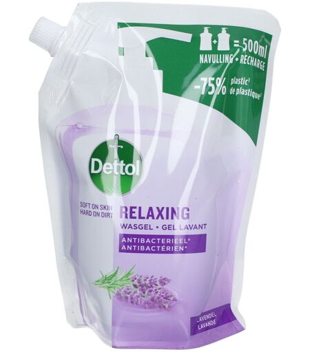 Dettol Relaxing Gel Lavant Antibactérien Lavande RechargeRecharge de gel lavant Dettol pour remplir votre pompe de savon classique : La recharge permet de remplir 2 pompes à savon, ce qui permet d'économiser jusqu'à 75 % de plastique. Le savon antibactérien garde les mains propres et protégées, avec un doux parfum de lavande.Recharge pour pompe à savonFormat recharge 500 ml : - 75 % de plastiqueAntibactérienDoux pour la peau, dur contre la saletéParfum lavande IngrédientsAqua, Ammonium Lauryl Sulfate, Sodium Laureth Sulfate, Glycerin, Sodium Chloride, Cocamide MEA, Parfum, Citric Acid, Salicylic Acid, Vitis Vinifera Fruit Water, Tetrasodium EDTA, Propylene Glycol, Coumarin, Lavandula Angustifolia Flower/Leaf/Stem Extract, Magnesium Nitrate, Methylchloroisothiazolinone, Magnesium Chloride, Methylisothiazolinone, Sodium Ferrocyanide, CI 60730. ...