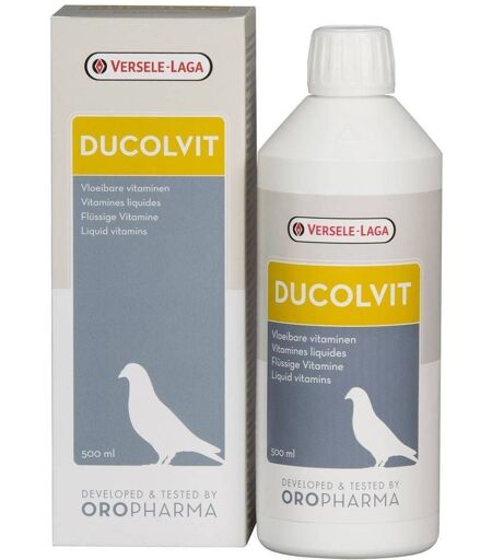 Aliment complémentaire pour pigeons. Oropharma Ducolvit est un complexe multi-vitaminé liquide. Ce complément alimentaire soutient la condition générale, est utile pendant l'élevage et aide à récupérer après une maladie. Les vitamines sont des matières organiques complexes dont le pigeon a besoin pour réguler les processus biologiques de son organisme. Elles sont essentielles pour être en bonne santé. Le pigeon ne peut pas fabriquer lui-même la plupart des vitamines et doit donc les puiser dans l'alimentation. Conseil d'utilisation 6 bouchons doseurs (30 ml) de Ducolvit par litre d'eau de boisson. Pendant toute l'année : une fois par semaine. Pendant les périodes qui nécessitent un apport accru en vitamines (maladie, élevage, efforts intenses) : deux fois par semaine. Préparation systématiquement fraîche de la solution. Composition: Sorbitol, Glycérine Constituants analytiques: Protéine brute 0,35%, Fibre brute 0%, Graisse brute 0,54%, Cendre brute 0,5%, Lysine 0%, Méthionine 0%, Sodium 0,13%, Humidité 97,5%. Additifs nutritionnels/k: Additifs nutritionnels: 3a672c Vitamine A 500000 UI, 3a671 Vitamine D3 40000 UI, 3a700 Vitamine E 1000 mg, 3a710 Vitamine K3 200 mg, 3a821 Vitamine B1 200 mg, Vitamine B2 400 mg, 3a841 Calcium D pantothénate 2000 mg, 3a831 Vitamine B6 205 mg, Vitamine B12 0,6 mg, 3a315 Niacinamide 1000 mg, 3a300 Vitamine C 2020 mg ...