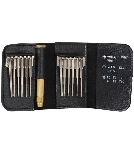 Jeu en chrome-vanadium pour l'électronicien. CARACTERISTIQUES : contenu: manche 3 x cruciforme: PH000/PH00/PH0 3 x plat: 1.5/2.0/2.5 6 x étoile: T5/T6/T7/T8/T9/T10 SPECIFICATIONS : longueur manche: 85mm longueur tournevis: 55mm dimensions trousse de rangement: ouvert: 192 X 95 X 20mm fermé: 60 x 95 x 25mm ...
