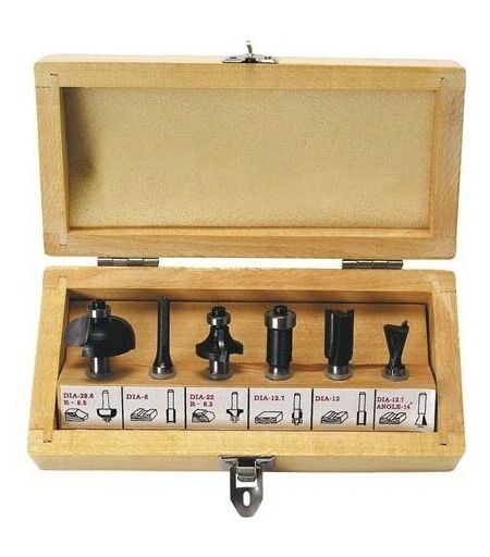 CARACTERISTIQUES : conditionnement: coffret en bois SPECIFICATIONS : contenu: fraise à gorge: ø 28.6mm / r=9.5mm fraise à rainurer droite: ø 6mm fraise pour découpe arrondie: ø 22mm / r=6.3mm lime d'ébarbage: ø 12.7mm fraise à rainurer droite: ø 12mm fraise à queue d'aronde: ø 12.7mm / angle 14° dimensions: 160 x 90 x 45mm poids: 345g ...