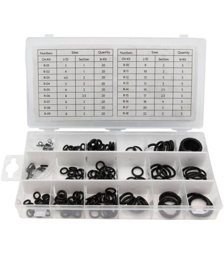 Description générale Ce jeu de joints toriques inclut 18 des tailles toriques les plus courantes, conçu pour une variété de tâches. Les joints en nitrile sont résistants à la chaleur, aux fluides à base de pétrole et de silicone, ainsi qu'aux solvants. Ils sont livrés dans un coffret pratique avec un tableau de mesure pour une identification de taille facile, ce qui en fait un choix idéal pour les mécaniciens de voiture et les machinistes. Spécifications techniques 3 x 1 mm (F0391X) : 10 pcs 4 x 1 mm (F0443X) : 10 pcs 4.8 x 1.9 mm (P5) : 20 pcs 5.8 x 1.9 mm (P6) : 20 pcs 6.8 x 1.9 mm (P7) : 20 pcs 7.8 x 1.9 mm (P8) : 20 pcs 8.8 x 1.9 mm (P8) : 15 pcs 9.8 x 2.4 mm (P10) : 15 pcs 10.8 x 2.4 mm (P11) : 15 pcs 11.8 x 2.4 mm (P12) : 10 pcs 13.8 x 2.4 mm (P14) : 10 pcs 15.8 x 2.4 mm (P16) : 10 pcs 5 x 2 mm (F0452X) : 10 pcs 8 x 2 mm (F0106X) : 10 pcs 20 x 3 mm (G20) : 10 pcs 22 x 3 mm (G22) : 10 pcs 20 x 4 mm (F0393X) : 5 pcs 22 x 4 mm (F0395X) : 5 pcs Compatibilité et accessoires ...