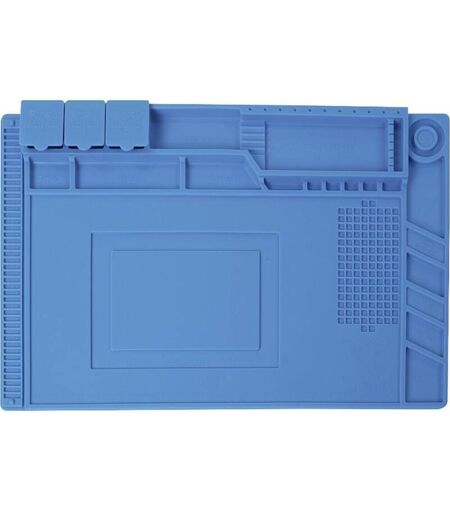 Ce tapis multifonctions est idéal pour réaliser vos travaux de soudage et de réparation. Données techniques Maximale Temperaturbeständigkeit 500 °C Informations sur le produit Primärfarben Blau,Tiefe des Produkts 300 mm,Höhe des Produkts 17 mm,Breite des Produkts 450 mm,Gewicht Produkt 680 g,Material Silikon, antistatisch Propriétés physiques Magnetische Bereiche Ja,Biegsam Ja,Aufbewahrungsboxen Ja,Ablagefächer Ja,Werkzeughalter Ja Caractéristiques d'utilisation Rutschhemmung Ja,Anti-Haftmittel Ja Taille de l'emballage 1 Volume de livraison Inhalt des Sets 3 kleine Ablagefächer3 magnetische Zonen ...