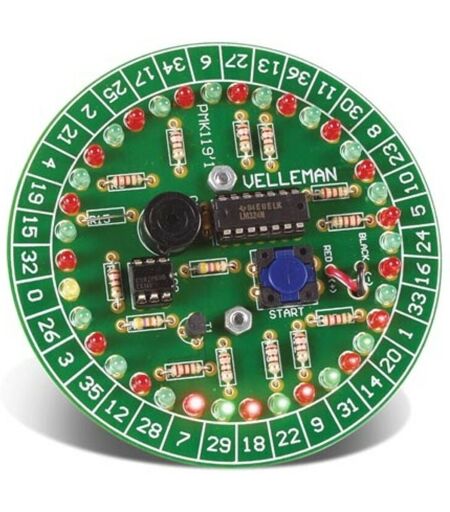 Whadda Kit de soudage, roulette, 37 LED Cette roulette avec technologie microprocesseur dispose de 37 LED, un effet sonore 'Spin' et un effet sonore 'Win' pour chaque couleur. L'effet sonore 'Spin' retentit en appuyant sur le bouton. Les LED et le son ralentissent jusqu'à ce qu'une LED soit finalement sélectionnée via un générateur aléatoire et vous entendez l'effet sonore 'Win' correspondant. De plus, il y a une animation LED entre deux jeux, offrant une présentation dynamique et visuellement attrayante. Après usage, le kit s'éteint automatiquement pour préserver les 3 piles AA de 1.5 V (non fournies). bricolage kit de soudage jouet créatif expérimentation débutant maker STEM avancé enfants adulte PCB CI LED roulette électronique MK119 Educatif Passionnant Creatif ...