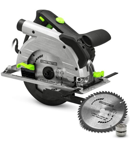 SCIE CIRCULAIRE Puissance: 1350W Vitesse variable: 2200 - 4700t/min Diamètre de la lame: 190mm (livré avec 1 lame de 24 dents et une seconde de 48 dents) Profondeur de coupe max: 66mm à 90° et 44mm à 45° Démarrage progressif Equipée d'un laser pour une découpe nette et précise Inclinaison 0-45° Base en aluminium Garantie 5 ans ...