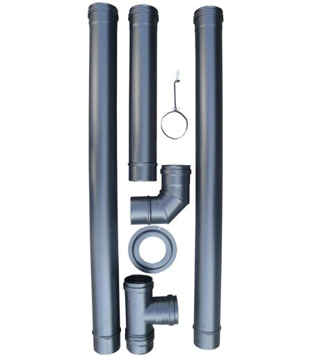KIT INSTALLATION POELE A PELLETS Matiere: acier peint en noir Epaisseur: 1.2mm 1 tuyau droit 50cm diametre 80mm 2 tuyaux droits 100cm diametre 80mm 1 coude 90° diametre 80mm 1 raccord T avec bouchon diametre 80mm 1 collier soutien tuyau diametre 80mm 1 rosace diametre 80mm 1 bride de securite avec cheville 7 joints en silicone ...
