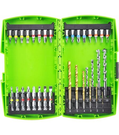 Ce coffret 34 mèches et embouts Constructor contient : - 16 embouts de vissage 25 mm: T10/T15/T20/T25 - PH0/PH1/PH2/PH3 - PZ0/PZ1/PZ2/PZ3 - SL3/SL4/SL5/SL6 - 8 embouts de vissage 50 mm: T15/T20 - PH1/PH2/PH3 - SL4/SL5/SL6 - 4 mèches béton : 5/6/8/10 mm - 6 mèches titane: 1/2/3/4/5/6 mm ...