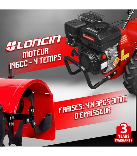 Vous êtes à la recherche d'un motoculteur rotovateur afin d'aérer et travailler la terre de votre potager ou de votre jardin ? Ce motoculteur rotovateur de la marque Elem Garden Technic équipée d'un moteur 4 temps de 212 CC vous propose une largeur de travail de 48cm et une profondeur de travail réglable de 17.5 à 33cm. Ces caractéristiques en font un outil idéal pour le travail de moyenne ou grande surface. Pour un confort de travail optimal, vous pouvez l'utilise en marche avant ou en marche arrière. Caractéristiques: - Moteur : OHV 4 TEMPS - Puissance : 212 cc / 4.1Kw - Torque max : 11.0NM / 2500t/min - Vitesse nominale : 3600 t/min - Largeur de travail MAX : 48 cm (4 x 3 fraises) - Profondeur de travail réglable: 17.5 à 33 cm - Capacité du réservoir d'essence : 3,6 L - Capacité du réservoir d'huile : 0,5 L - Marche avant et marche arrière - Roues tous terrains - Diamètre des roues : 30cm - Largeur des roues : 10cm - Type d'huile conseillée : SAE10W-30 - Type d'huile de transmission conseillée : SAE80W-90 - Poids net : 70kg ...