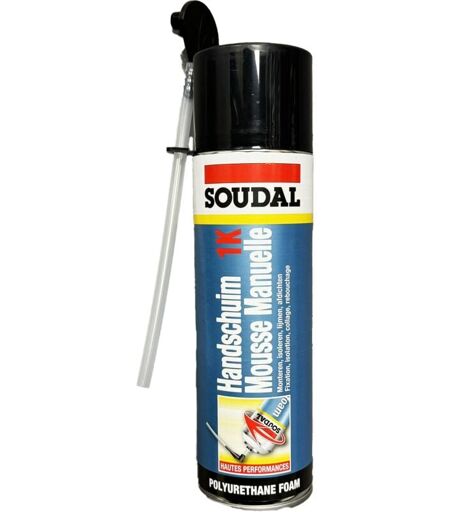 Mousse polyuréthane manuelle 500mL - Soudal La Mousse Manuelle 1K est une mousse polyuréthane monocomposante, auto-expansive, conçue pour un usage tête en bas. Elle offre une excellente adhérence sur la plupart des supports, à l'exception du PE, PP et PTFE. Caractéristiques principales : Grand rendement de remplissage : Permet de remplir efficacement les cavités. Sans reprise ni post-expansion : Garantit une expansion contrôlée sans risque de déformation après application. Isolation thermique et acoustique de haute qualité : Idéale pour améliorer l'isolation dans diverses applications. Applications : Remplissage de cavités : Pour une couverture rapide et efficace des espaces vides. Application d’une couche silencieuse : Réduction des bruits et vibrations. Optimisation de l’isolation dans le domaine de la réfrigération. Convient à toutes les applications de mousse dans des joints statiques . Mode d'emploi : Agiter vigoureusement l’aérosol pendant 20 secondes avant utilisation. Visser ...