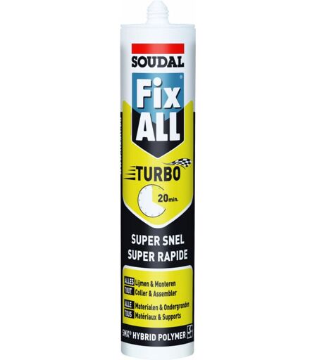 Durcissement très rapide Le Fix All® Turbo est un mastic-colle, à base de SMX polymères, neutre et élastique, pour tout collage super rapide. Certifié KOMO. Collages dans l'industrie de construction et bâtiment, permet la fixation de panneaux, profiles, plinthes, plaques d'isolation, seuils, appuis de fenêtres, cadres, carrelages, … Manipulable et durcissement très rapide ...