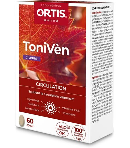 Complément alimentaire à utiliser dans le cadre d'une alimentation variée, équilibrée et d'un mode de vie sain.Tonivèn de Ortis® est un complément alimentaire à base de plantes.Vigne rouge, petit houx, marron d’inde, aident à soutenir une circulation normale.La vitamine E contribue à protéger les cellules contre le stress oxydatif.La vitamine C contribue à la formation normale de collagène pour assurer le fonctionnement normal des vaisseaux sanguins.Composition :Agent de charge: cellulose microcristalline; extraits secs de: marron d’inde (Aesculus hippocastanum L. – 376 mg/2 comp.), vigne rouge (Vitis vinifera L. – 318 mg/2 comp.); jus atomisé d’acérola (Malpighia punicifolia L. – 180 mg/2 comp.); maltodextrine; extrait sec de petit houx (Ruscus aculeatus L. – 114 mg/2 comp.); troxérutine (54 mg/2 comp.); agents d’enrobage: hydroxypropylmethylcellulose, hydroxypropylcellulose, talc; antiagglomérants: stéarate de magnésium, dioxyde de silice; vitamine E (acétate de d-alpha tocophérol - 7,5mg/2comp.)Valeur nutritionnelle : Par 100 gPour 2 compr.Vitamine C1 971 mg36 mg (=45 % AJR*)Vitamine E410 mg7,5 mg = (62,5 % AJR*)* AJR = Apports journaliers recommandésConseils d'utilisation :Prendre 1 comprimé 2 fois par jour, pendant les repas, avec un grand verre d’eau. Poursuivre la prise de Toniven pendant 3 semaines minimum. Reprendre Toniven après une semaine d’arrêt si besoin.Précautions d'emploi :Ne pas dépasser la dose journalière recommandée. Tenir hors de portée des enfants. L’emploi chez les personnes sous traitement anticoagulant ou antiplaquettaire est déconseillé. Ne pas utiliser en cas de grossesse et d’allaitement. Convient aux végétariens. La couleur, l’odeur et le goût de ce produit peuvent varier sans en affecter sa qualité et son efficacité. Ceci est dû au caractère naturel des ingrédients.Conditionnement60 comprimésFabricant :ORTIS AG-SA-NV,46 Hinter der Heck,4750 Elsenborn/Bütgenbach,Belgique ...