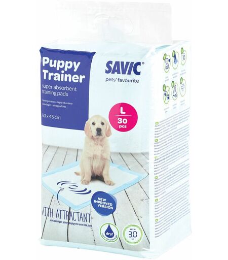 Les tapis éducateurs absorbants Puppy Trainer vous permettront d'apprendre la propreté à votre chiot. Ces alèses, grâce à une couche de gel, absorberont les liquides ainsi que les odeurs. Disponibles en 5 tailles. Tapis éducateurs Puppy Trainer Savic, Idéal pour l'éducation du chiot, Surface du tapis faite d'une structure en nid d'abeilles douce et confortable pour les chiots, sous laquelle se situe une couche de gel absorbante. Aide votre chiot à devenir propre, Peut être utilisé par votre chien adulte incontinent, Neutralise les mauvaises odeurs, Enferme l'humidité, permettant aux pattes de votre chien de rester propres et sèches, Peut être utilisé dans les paniers de transport et les chenils, Disponibles en lot de 30 ou 50 tapis, Dimensions : Taille M (C0522) - 30 tapis : 30 x 45 cm, Taille L (C0523) - 30 tapis : 45 x 60 cm, Taille M (C0555) - 50 tapis : 30 x 45 cm, Taille L (C0557) - 50 tapis : 45 x 60 cm, Taille XL (C0558) - 30 tapis : 90 x 60 cm, ...