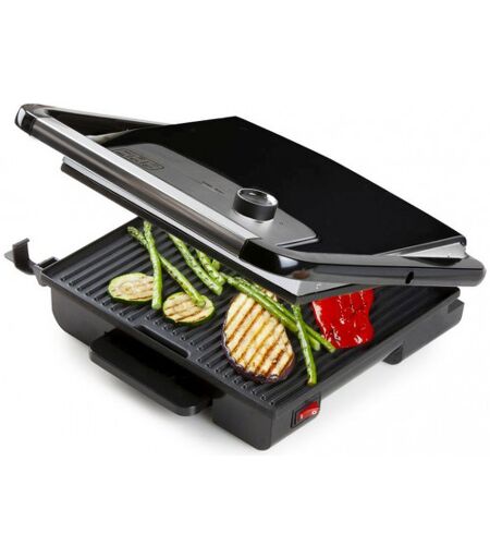 Spécifications: • Parfait pour griller des sandwiches, panini, de la viande, du poisson, des légumes,... • Surface de cuisson : 29,5 x 26,5 cm • Couvercle flottant qui s’adapte automatiquement au contenu, pour un contact optimal • Thermostat réglable • Témoins lumineux pour marche/arret et pret a l’emploi • Récipient pour l’exces de graisse • Revetement anti-adhésif de haute qualité • Boîtier en acier inoxydable cool touch • Peut etre mis debout pour un rangement facile et compact> ...