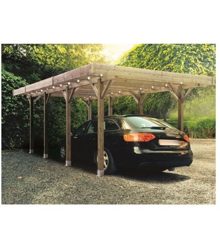 Fiche technique. Largeur avec d?bordement du toit 3,064 m. Profondeur avec d?bordement du toit 5,064 m. Hauteur maximale 2,730 m. Surface avec d?bordement du toit 15,51 m?. Dimension des poteaux de sout?nement 120 x 120 mm. Largeur utile 2,100 m. Profondeur utile 5,064 m. Hauteur utile 2,310 m. Forme de la toiture plate. Bois trait? oui, impr?gnation autoclave. Essence de bois sapin du Nord certifi?. Plancher non. Bois peint non. Montage ? monter soi-m?me. Marque Solid Superia. Mod?le Carport S7721. Caract?ristiques et avantages. Ce carport sert de parking et prot?ge votre v?hicule : le carport r?duit la condensation sur votre v?hicule, ce qui r?duit le risque de rouille et ?vite le gel en hiver. En ?t?, le carport prot?ge votre v?hicule des rayons br?lants du soleil.. Le bois trait? subit une impr?gnation sous pression en autoclave qui aura pour effet d'emp?cher la destruction du bois par les insectes et/ou les champignons.. Garantie : Tous les garages Solid b?n?ficient d'une garantie de 2 ans contre les vices de fabrication. ...