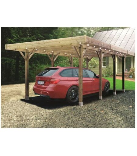 Fiche technique. Largeur avec d?bordement du toit 4,064 m. Profondeur avec d?bordement du toit 5,064 m. Hauteur maximale 2,730 m. Surface avec d?bordement du toit 20,58 m?. Dimension des poteaux de sout?nement 120 x 120 mm. Largeur utile 2,700 m. Profondeur utile 5,064 m. Hauteur utile 2,310 m. Forme de la toiture plate. Bois trait? oui, impr?gnation autoclave. Essence de bois sapin du Nord certifi?. Plancher non. Bois peint non. Montage ? monter soi-m?me. Marque Solid Superia. Mod?le Carport S7722. Caract?ristiques et avantages. Ce carport sert de parking et prot?ge votre v?hicule : il r?duit la condensation sur votre v?hicule, ce qui r?duit le risque de rouille et ?vite le gel en hiver. En ?t?, le carport prot?ge votre v?hicule des rayons br?lants du soleil.. Le bois trait? subit une impr?gnation sous pression en autoclave qui aura pour effet d'emp?cher la destruction du bois par les insectes et/ou les champignons.. Garantie :. Tous les garages Solid b?n?ficient d'une garantie de 2 ans contre les vices de fabrication. ...