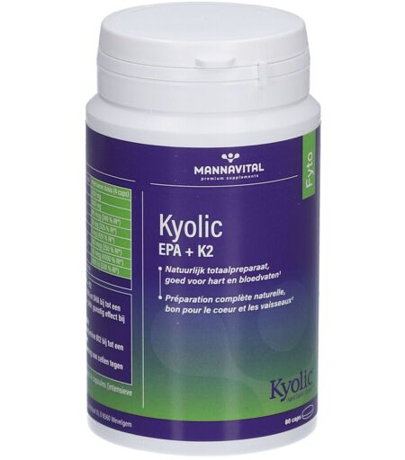 Complément alimentaire à utiliser dans le cadre d’une alimentation variée, équilibrée et d’un mode de vie sain.Mannavital Kyolic EPA+K2Grâce à l'ail fermenté, Kyolic EPA+K2 contribue au fonctionnement normal du cœur, maintien d'un taux de cholestérol normal, maintien d'une fonction hépatique normale et fonctionnement normal du système immunitaire*.* Allégation de santé en attente d’approbation par l’EFSA.IngrédientsIngrédients actifs pour 2 et 4 gélulesAged Garlic Extract® 600 mg 1200 mgEPA + DHA (huile de poisson) 500 mg 1000 mgVitamine K2 (ménaquinone-7 de natto) 90 mcg (120 % AR*) 180 mcg (240 % AR*)Vitamine E (tocophérols mélangés) 19,5 mg (163 % AR*) 39 mg (325 % AR*)Vitamine B6 (pyridoxal-5’-phosphate) 3 mg (214 % AR*) 6 mg (429 % AR*)Folate -Vit B9/M (5-méthyltétrahydrofolate de calcium) 250 mcg (125 % AR*) 500 mcg (250 % AR*)Vitamine B12 (méthycobalamine) 50 mcg (2000 % AR*) 100 mcg (4000 % AR*)Vitamine D3 (cholécalciférol) 500 IU (250 % AR*) 1000 IU (500 % AR*)* AR = Apport de référenceExcipientsEnveloppe (gélatine, stabilisateur : glycérine), ail fermenté, agent antimousse (cire d'abeille), émulsifiant (lécithine de soja).Conseils d'utilisationDose d'attaque : 4 gélules par jourDose d'entretien : 2 gélules par jourPrécautions d'emploiConserver dans un endroit frais et sec.Tenir hors de portée des jeunes enfants.Ne pas dépasser la dose recommandée.Poids net80 gélulesFabricantMannavitalZuidstraat 108560 WevelgemBelgique ...