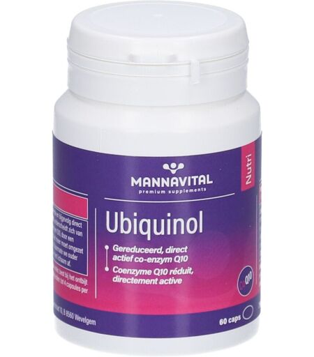 Complément alimentaire à utiliser dans le cadre d’une alimentation variée, équilibrée, d’un mode de vie sain.Avec de la vitamine C et du sélénium qui contribuent à la protection des cellules contre le stress oxydatif et au fonctionnement normal du système immunitaire - avec de la vitamine C qui contribue à un métabolisme énergétique normal et à réduire la fatigue. Composition: Huile de tournesol, enveloppe (gélatine, stabilisant: glycérol, colorant: oxyde de fer rouge, oxyde de fer noir), ubiquinol, anti-agglomérant 8dioxyde de silicium), emulsifiant (lécithine de soja).Valeur nutritionelle: Pour 1 capsule% VNR*Ubiquinol50 mg *Valeur nutritionnelle de référence Conseil d'utilisation:1 à 2 capsules par jour, avec un verre d'eau, de préférence pendant le petit-déjeuner et/ou le déjeuner.Dans des circonstances spéciales, on peut prendre jusqu'à 4 capsules par jour.Précautions d'emploi: Ne pas dépasser la quantité journalière prescrite. Conserver au frais, au sec et à l'abri de la lumière. Tenir hors de portée des enfants.Poids net: 29 g = 60 capsulesFabricant:MannavitaZuidstraat 108560 Wevelgem ...