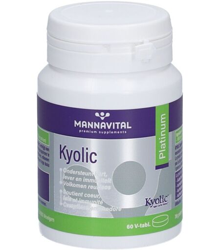 Complément alimentaire à utiliser dans le cadre d’une alimentation variée, équilibrée et d’un mode de vie sain.Contribue à : la fonction normale du coeur - le maintien d'un taux normal de cholestérol, triglycérides et homocystéine - le maintien d'une fonction hépatique normale - la fonction normale du système immunitaire - la résistance au stress temporaire et la protection antioxydante du corps.Celui qui veut profiter au maximum de l'action largement bénéfique de l'ail sur la santé, et ce, sans gêne d'odeur, tient avec KYOLIC Ail fermenté (AGED GARLIC EXTRACT®) le complément alimentaire idéal. En agissant sur plusieurs facteurs à risques à la fois (cholestérol, triglycérides, homocystéine), KYOLIC PLATINUM est avant tout un excellent remède pour maintenir la santé du coeur et des vaisseaux. En outre, son action renforçatrice sur les défenses, soutien du foie et protection des cellules, est largement documentée.Composition:1000 mg Ail fermenté ou AGED GARLIC EXTRACT® (Allium sativum) Conseil d'utilisation:1 à 2 comprimés par jour.Précautions d'emploi:Ne pas dépasser la dose journalière recommandée. Conserver à température ambiante dans un endroit sec, à l'abri de la lumière. Tenir hors de portée des jeunes enfants. Poids net: 78 g = 60 comprimésFabricant: MANNAVITA Zuidstraat 108560 Wevelgem ...