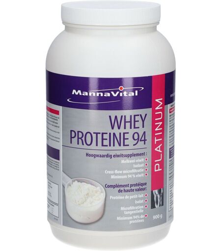 Complément alimentaire à utiliser dans le cadre d’une alimentation variée, équilibrée et d’un mode de vie sain.Dans certaines circonstances telles que le sport et l'entraînement intensif, une poussée de croissance, une alimentation unilatérale, en récupération... une source complémentaire de protéines peut être la bienvenue. La protéine de petit-lait est idéale dans ce cas : non seulement cette protéine possède une excellente composition de tous les acides aminés essentiels dans un bon rapport, mais elle est également facile à digérer et à absorber. Choisissez cependant une préparation de protéine de petit-lait de qualité sous forme d'isolat, telle que WHEY PROTEIN 94 PLATINUM, qui de plus est sans sucre, édulcorants et exhausteurs de goûts synthétiques.IngrédientsIsolat de protéine de petit-LAIT (minimum 94 % de protéines), obtenu par microfiltration tangentielle, émulsifiant (lécithine de SOJA 0,3 %). Contient des quantités minimes de lactose et peut contenir des traces de protéine de LAIT (caséine) et de protéine de SOJA.Allergènes : Soja, Lait.Valeurs nutritionnellesAnalyse nutritionnellepar 100 gpar 30 gEnergie1611 kJ/379 kcal483 kJ/114 kcalProtéines (extrait sec)94 g28,2 gLipides0,2-1 g0,06 - 0,3 gHydrates de carbone (lactose)0,5 g - 0,9 g0,15 - 0,27 gConseils d'utilisationLe dosage idéal pour un adulte est de 30 g (3 mesures), à prendre sur la journée ou en une fois. Comme dose d’entretien, 10 à 20 gr par jour su sent (1 à 2 mesures). Dans des circonstances spéciales, on peut prendre jusqu’à 40 gr. Pour les enfants: demi dosage.WHEY PROTEINE 94 peut être dilué dans de l’eau, boissons aux céréales ou aux noix, lait écrémé, jus de fruits...... et est facile à préparer avec un blender ou mixer.Précautions d'emploiConserver dans un endroit frais et sec.Tenir hors de portée des jeunes enfants.Ne pas dépasser la dose recommandée.Poids net900 gAdresse du FabricantMannavitalZuidstraat 10,8560 WevelgemBelgique ...