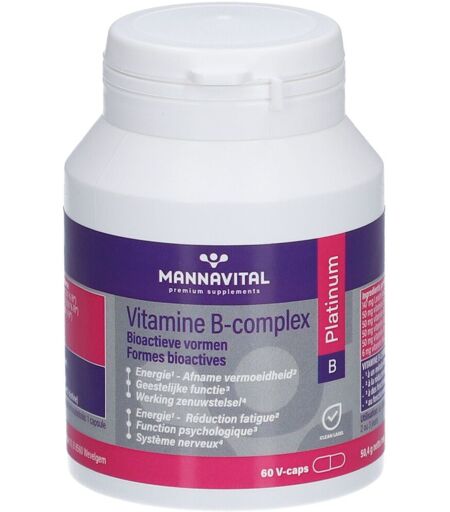 Complément alimentaire à utiliser dans le cadre d’une alimentation variée, équilibrée et d’un mode de vie sain.Mannavital Vitamine B Complex PlatinumLe complexe de vitamine B est un groupe de substances vitales qui (très souvent en synergie) remplissent un large éventail de fonctions corporelles importantes.Mannavital Vitamine B Complex Platinum présente deux avantages majeurs :Les vitamines B sont proposées sous leur forme directement active et facilement absorbable, et elles sont fournies dans une dose appropriée et sûre ;En outre, la base de la levure de bière assure l'apport de cofacteurs qui soutiennent l'absorption et l'action des vitamines B.IngrédientsIngrédients actifs par capsule végétale :50 mg de vitamine B1 (4545 % AR*): dont 5 mg de pyrophosphate de thiamine et 45 mg de chlorhydrate de thiamine50 mg de vitamine B2 (3571% AR*): sous forme de riboflavine-5-phosphate (pas de riboflavine)50mg de vitamine B3 (313 % AR*): comme niacinamide50 mg de vitamine B5 (833 % AR*): comme D-panthothénate de calcium6 mg de vitamine B6 (428 % AR*): sous forme de pyridoxal-5’-phosphate (pas de chlorhydrate de pyridoxine)500 mcg de vitamine B9/B11/M/acide folique (250 % AR*): sous forme de 5-méthyltétrahydrofolate ou 5-MTHF (pas d’acide folique, ni de folate)50 mcg de vitamine B12 (2000 AR*) , sous forme de 50 % de méthylcobalamine et 50 % d’adénosylcobalamine (pas de cyanocobalamine)500 mcg de D-biotine (1000 % AR*)50 mg de choline sous forme de bitartrate de choline50 mg d’inositol15 mg PABA (acide para-aminobenzoïque)147 mg de levure de bière* AR = Apport de référenceExcipientsSaccharomyces cerevisiae, agent d'enrobage (hydroxypropylmethylcellulose). Oryza sativa (extrait de son de riz), nicotinamide, émulsifiant (glycérylbéhénate), amidon de riz.Sans gluten ni lactose. Sans sucre ajouté.Conseils d'utilisationPrendre 1 gélule par jour avec un verre d'eau, au repas principal.Précautions d'emploiConserver dans un endroit frais et sec.Tenir hors de portée des jeunes enfants.Ne pas dépasser la dose recommandée.Poids net60 gélulesFabricantMannavitaZuidstraat 108560 WevelgemBelgique ...