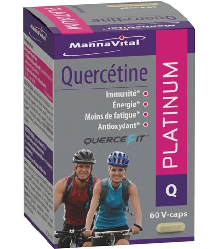 Complément alimentaire à utiliser dans le cadre d’une alimentation variée, équilibrée et d’un mode de vie sain.La quercétine est une substance spéciale de la nature qui est parfois appelée la “reine des bioflavonoïdes” et qui contribue aux effets bénéfiques des baies de sureau, des canneberges, des oignons rouges, du chou vert, du thé vert et des pommes. En combinant la quercétine de l’arbre à miel hautement absorbable avec la vitamine C, QUERCETINE PLATINUM devient un remède optimal pour renforcer la résistance, respirer plus librement au printemps, fournir de meilleures prestations sportives et rester jeune plus longtems.Soutient le fonctionnement normal du système immunitaire (vit C) Renforce la résistance Aide à respirer plus librement Soulage les troubles saisonniers Améliore l’endurance Contribue au métabolisme énergétique normal et à la réduction de la fatigue (vit C) Aide à protéger les cellules et les tissus contre le stress oxydatif (vit C) Aide à rester jeune et fraisQuercetine PlatinumContient le QUERCEFIT® ou phytosome de la quercétine, qui a fait l’objet de recherches scientifiques et qui, en se liant à la lécithine de tournesol, est 11 fois plus soluble dans les intestins et entraîne des taux sanguins de quercétine 20 fois plus élevés que la quercétine ordinaireContient de la vitamine C sous forme de vitamine C liposomale, qui est 20% plus absorbable que la vitamine C ordinaireLa meilleure absorption et le meilleur effet de QUERCEFIT ont été scientifiquement prouvés par 4 études cliniquesComposition:250 mg de phytosome de quercétine (Quercefit®), standardisé sur 100 mg de quercétine, avec 150 mg de phosphatidylcholine provenant de la lécithine de tournesol73,5 mg de vitamine C lipsomale, avec 50 mg de vitamine C (63 % RI*, 3 caps = 188 % RI )Valeur nutritionnelle: Pour 1 capsule*AJRPhytosome de quercétine (Quercefit®) - Quercétine - Phosphatidylcholine 250 mg100 mg150 mg Vitamine C lipsomale - Vitamine C 73,5 mg50 mg63 %*Apport journalier de référenceConseil d'utilisation:2 capsules par jour.Dose intense : 3 capsules par jour.Précautions d'emploi:Ne pas dépasser la dose journalière. Conserver à une température ambiante (15-25°C), sec et à l'abri de la lumière. Tenir hors de portée des enfants.Poids net:60 capsFabricant:MannavitalZuidstraat 108560 Wevelgem ...