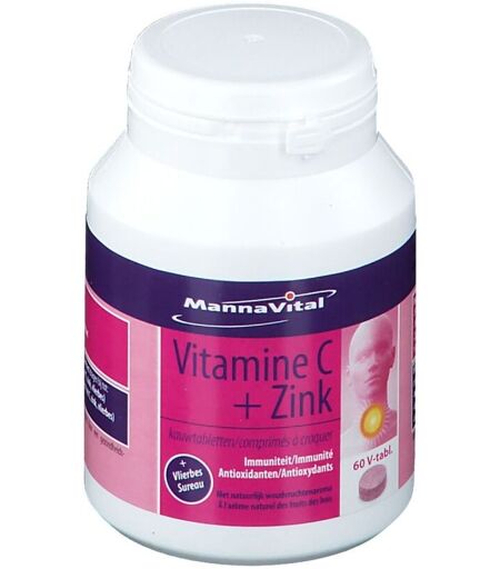 Complément alimentaire à utiliser dans le cadre d’une alimentation variée, équilibrée et d’un mode de vie sain.VITAMINE C + ZINC - les comprimés à croquer de Mannavital combinent le zinc, la vitamine C et le sélénium, trois nutriments essentiels qui contribuent au fonctionnement normal du système immunitaire et à la protection des cellules contre le stress oxydatif. La particularité de ces comprimés est qu'ils contiennent également un extrait de sureau très concentré, qui soutient les voies respiratoires*.Les comprimés sont exempts de sucre raffiné et sont sucrés avec les glycosides de stéviol et les alcools de sucre mannitol et xylitol. Ils contiennent, comme aromatisant, un arôme naturel de fruits des bois. Ces comprimés à croquer se combinent exceptionnellement bien avec la VITAMINE D3 + VITAMINE A Forte et avec la QUERCETINE PLATINUMIngrédientsÉdulcorants (mannitol, xylitol, glycosides de stéviol 97% Reb. A), ascorbate de calcium, acide L-ascorbique, sureau, citrate de zinc, arôme naturel de fruits des bois, extrait de son de riz (oryza sativa), émulsifiant (glycérylbéhénate), huile de colza (brassica napus).Valeurs nutritionnelles Pour 1 capsule %AJR* Vitamine C 500 mg 625 % Extrait de sureau 100 mg Zinc 22,5 mg 150 % Sélénium 100 µg 182 % *Apport de référenceConseils d'utilisation1 comprimé à croquer par jour ou selon la prescription d'un professionnel de la santé.Précautions d'emploiUn complément alimentaire ne se substitue pas à un régime alimentaire varié et équilibré ou à un mode de vie sain. Conserver dans un endroit frais et sec. Tenir hors de portée des enfants. Ne pas dépasser la dose recommandée.Poids net96 g = 60 comprimésAdresse du FabricantMannavitaZuidstraat 108560 WevelgemBelgique ...