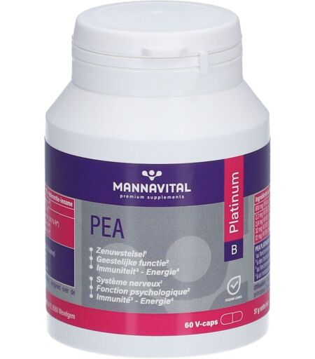 Les compléments alimentaires ne remplacent pas une alimentation équilibrée et variée et un mode de vie sain.MannaVital PeaComplément alimentaire avec complexe de vitamines BIngrédients : Palmitoyléthanolamide, LipiSperse® (Levagen + TM ), vitamine B1, vitamine B2, vitamine B3, vitamine B5, vitamine B6, acide folique/vitamine B9, vitamine B12 (méthylcobalamine, 200% RI).Valeurs nutritionnelles : Pour 3 capsules Vitamine B1 2,2 mg Vitamine B2 2,8 mg Vitamine B3 32 mg Vitamine B5 12 mg Vitamine B6 2,8 mg Acide folique 400 µg Vitamine B12 50 µg Biotine 100 µg Apports recommandés : Prendre 3 capsules 1x par jour avec suffisamment de liquide.Conseil :Ne pas dépasser la dose journalière recommandée. Stockage :Conserver dans un endroit frais (6-25 °C) à l'abri de la lumière. Tenir hors de portée des enfants.Quantité nette : 60 capsules = 36 g Fabricant : FYTOFARMA Zuidstraat 10 8560 WevelgemBelgien ...