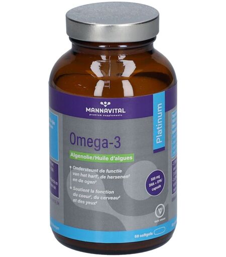 Complément alimentaire à utiliser dans le cadre d’une alimentation variée, équilibrée et d’un mode de vie sain.L'acide gras oméga-3 DHA est un élément structurel indispensable dans notre organisme, notamment dans le cerveau, les yeux et les vaisseaux sanguins. En outre, avec l'acide gras oméga-3 EPA, il contribue au bon fonctionnement de diverses fonctions de l'organisme. Malheureusement, les acides gras oméga-6 concurrents sont maintenant très présents dans le régime alimentaire ; pour rétablir l'équilibre, un apport supplémentaire de DHA et d'EPA via l'HUILE D'ALGUES OMEGA-3 PLATINUM de Mannavital peut être approprié. HUILE D'ALGUES OMEGA-3 PLATINUM est 100% végétal, de la plus haute qualité et proposé au meilleur prix.BénéficesProduit 100 % végan, y compris la paroi de la capsuleHuile d'algues provenant de la microalgue Schizochytrium sp. cultivée de manière durablecontient le rapport naturel des acides gras oméga-3 DHA et EPA dans les algues (environ 2:1)n'est pas un isolat pur de DHAdosage élevé : 500 mg DHA + EPA/capsuleles acides gras oméga-3 se présentent sous leur forme naturelle, ce qui contribue à une absorption maximale.contient comme antioxydants naturels, pour un taux d'oxydation aussi bas que possible : tocophérols mixtes, palmitate d'ascorbyle et huile de romarinnon irradiésans additifs synthétiques, ni soja, ni glutenIngrédientsIngrédients actifs par softgel végétarienne:1000 mg Life’s OmegaTM 60, contenant 962,7 mg d’huile riche en DHA et EPA provenant de la microalgue Schizochytrium sp., de qualité supérieure, dont les acides gras oméga-3:- min 300 mg DHA (Acide docosahexaénoïque)- min 150 mg EPA (Acide eicosapentaénoïque)- min 500 mg DHA + EPA- min 550 mg total d’acides gras oméga-3Conseils d'utilisation60 gélulesPrécautions d'emploiNe pas dépasser la dose journalière. Conservation au frais et au sec à l'abri de la lumière. Hors de portée des enfants.Poids net60 gélulesAdresse du FabricantBVBA MannavitaZuidstraat 108560 Wevelgem ...