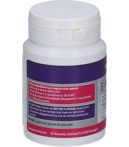 Complément alimentaire à utiliser dans le cadre d’une alimentation variée, équilibrée et d’un mode de vie sain.La vitamine B biotine est connue pour être un élément essentiel à la production de la protéine structurelle kératine, qui apporte dureté et fermeté à la peau, aux cheveux et aux muqueuses. BIOTINE PLATINUM contient une dose efficace de la forme bioactive (D-biotine), ainsi que la forme bioactive du silicium et de la vitamine C, de sorte que ce complément alimentaire contribue également à la production de cette autre protéine structurelle importante : le collagène. En contribuant à la production de kératine et de collagène, BIOTINE PLATINUM est un outil précieux dans les soins des cheveux et de la peau.IngrédientsD-Biotine, vitamine C, dioxyde de silicium bioactif, Cellulose microcristalline (stabilisant), hydroxypropylméthylcellulose (enveloppe), farine de riz (Oryza sativa) Valeurs nutritionnellesIngrédientQuantité par capsule% RI*D-Biotine3000 µg6000%Vitamine C (acide L-ascorbique)80 mg100%Dioxyde de silicium bioactif (Mesoporosil®)50 mg (dont 6 mg de silicium)/Conseils d'utilisation1 capsule par jour avec un verre d'eau Poids net60 capsulesAdresse du FabricantMannavitalZuidstraat 108560 WevelgemBelgië/Belgique ...