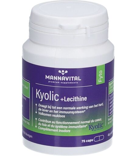 Complément alimentaire à utiliser dans le cadre d’une alimentation variée, équilibrée et d’un mode de vie sain.Mannavital Kyolic + LecithineKYOLIC + LECITHINE est la combinaison active d'ail fermenté et de lécithine de soja. L'ail contribue :au fonctionnement normal du cœur* ;au maintien d'un taux de cholestérol normal* ;au maintien d'une fonction hépatique normale* ;au fonctionnement normal du système immunitaire*.Ce complément alimentaire contient également de la choline, qui contribue à un métabolisme normal des graisses et au maintien d'une fonction hépatique normale.* Allégation de santé en attente d’approbation par l’EFSA.IngrédientsAil fermenté, lécithine de soja, gélatine (agent d'enrobage), anti-agglomérants (dioxyde de silice, stéarate de magnésium).Données nutritionnellesPar gélule :300 mg d'ail fermenté ou AGED GARLIC EXTRACT®(Allium sativum)190 mg de lécithine de soja (min. 4,4 mg choline)Conseils d'utilisation2 (dosage d'entretien) à 4 (dosage de départ) gélules par jour.Précautions d'emploiConserver dans un endroit frais et sec.Tenir hors de portée des enfants.Ne pas dépasser la dose recommandée.FabricantFytofarmaZuidstraat 10,8560 WevelgemBelgique ...
