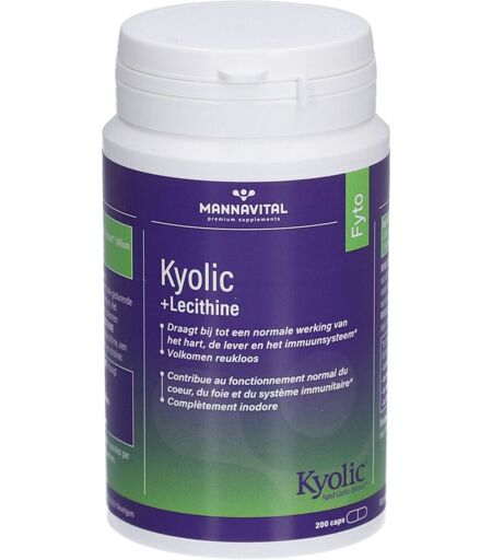 Complément alimentaire à utiliser dans le cadre d’une alimentation variée, équilibrée et d’un mode de vie sain.Mannavital Kyolic + Lecithine est un complément alimentaire associant ail fermenté et lécithine de soja. L’ail aide au fonctionnement normal du cœur, au maintien d’un taux de cholestérol normal et à une fonction hépatique normale. La choline contenue dans la lécithine contribue également au métabolisme normal des graisses et au maintien d’une fonction hépatique normale.IngrédientsAil fermenté, lécithine de SOJA, gélatine (agent d'enrobage), anti-agglomérants : dioxyde de silice, stéarate de magnésium.Allergènes : Soja.Valeurs nutritionnelles Par gélule Ail fermenté (AGED GARLIC EXTRACT®) 300 mg Lécithine de soja 190 mg Choline (minimum) 4,4 mg Conseils d'utilisationDosage d'entretien : 2 gélules par jour.Dosage de départ : 4 gélules par jour.Précautions d'emploiNe pas dépasser la dose journalière recommandée. Un complément alimentaire ne remplace pas une alimentation variée et équilibrée ni un mode de vie sain. Conserver dans un endroit frais et sec. Tenir hors de portée des enfants.Poids net200 capsulesAdresse du FabricantFytofarmaZuidstraat 10,8560 Wevelgem, Belgique. ...