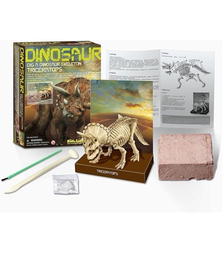 Kit de fouille - Squelette de Triceratops 4M Kidz Labs. Déterre puis recompose ton dinosaure. Jouez à l'expert en paléontologie ! Déterrez les os d'un dinosaure qui régnait sur la Terre il y a des millions d'années. Assemblez ensuite les pièces pour former le squelette d'un incroyable Tricératops, ce dinosaure qui ressemblait à un rhinocéros à trois cornes avec une crête autour du cou. Contenu du kit : 1 bloc de plâtre, 1 outil de fouille, 1 brosse, cire molle pour positionner les articulations, décor en carton portant des informations amusantes. Maquette assemblée : 19 cm de long. ...